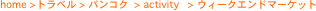 ■ウィークエンドマーケット ウィークエンドマーケットをスカイトレインから見ると、グレーのトタン屋根の連なり。 暑い!臭い!広すぎて迷子になるなど、そうとう覚悟が必要なウワサを耳にしたので、 せめて混雑と暑さを避けるべく、朝9時には最寄り駅モーチットに到着。 いっしょに降りる人たちも観光客ばかり。 まだ多くのぐらいのお店は開店準備中で(といってもほしいものがあればすぐに売って くれそうでした)風も涼しく、人もまばらだったので、 聞いていたほどしんどいことはありません。 これだけ種類も多く、同じ商品を扱うお店もたくさんあって、いったいどれを 買っていいやら。ひとつだけで物足りないような気分になるし、かといって持って帰れる 量は限られているので、たくさんはいらない。 悩ましい。あーでもない、こーでもない。 冷静に考えてみると、本当はほしいのかどうか?!。 というで早々退散しました。 | |||